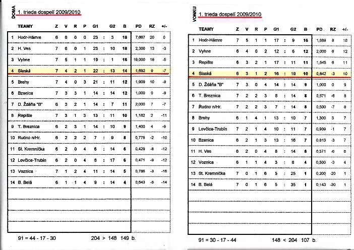 Slaská na jeseň odohrala 13 majstrovských zápasov, v ktorých dokázala streliť 38 gólov. Inkasovala však až 32x a to nieje práve najlepšia vizitka našej obrany. Najlepším strelcom v Slakej je so 16. gólmi TOMÁŠ SILNÝ, ktorý je zároveň najlepším strelcom celej súťaže. 7 gólov strelil kapítán Jožko Vanko a 6 krát sa trafil aj Palko Gordulič, kotrému na to stačili 4 zápasy. Po jesennej časti sa Slaská usídlila na 4. mieste len o skóre za Hornou Vsou. Kompletné tabuľky doma a vonku hraných zápasov, ako aj strelené góly a ostatné výsledky nájdete tu: Tabuľky nájdete aj v sekcií fotogaléria